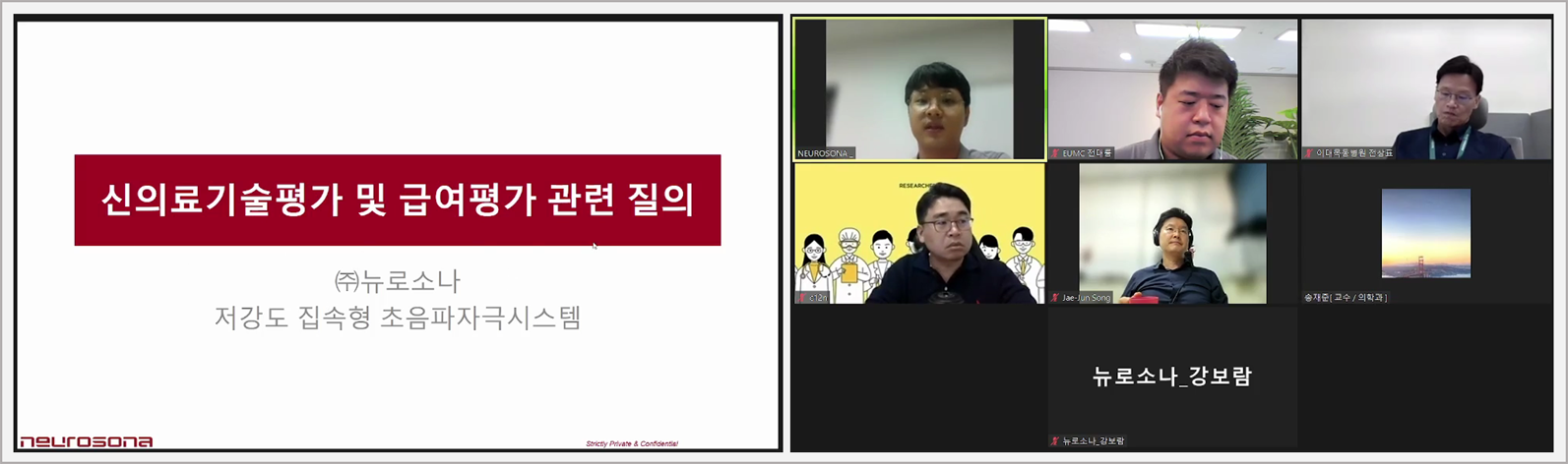지난 8월 30일 뉴로소나 사의 저강도 집속형 초음파자극시스템의 제품 인허가와 제품화를 위해 고대구로병원 이비인후과 교수 겸 (주)뉴라이브를 창업하신 송재준 대표님을 모시고 온라인으로 공동연구 미팅을 가졌습니다.