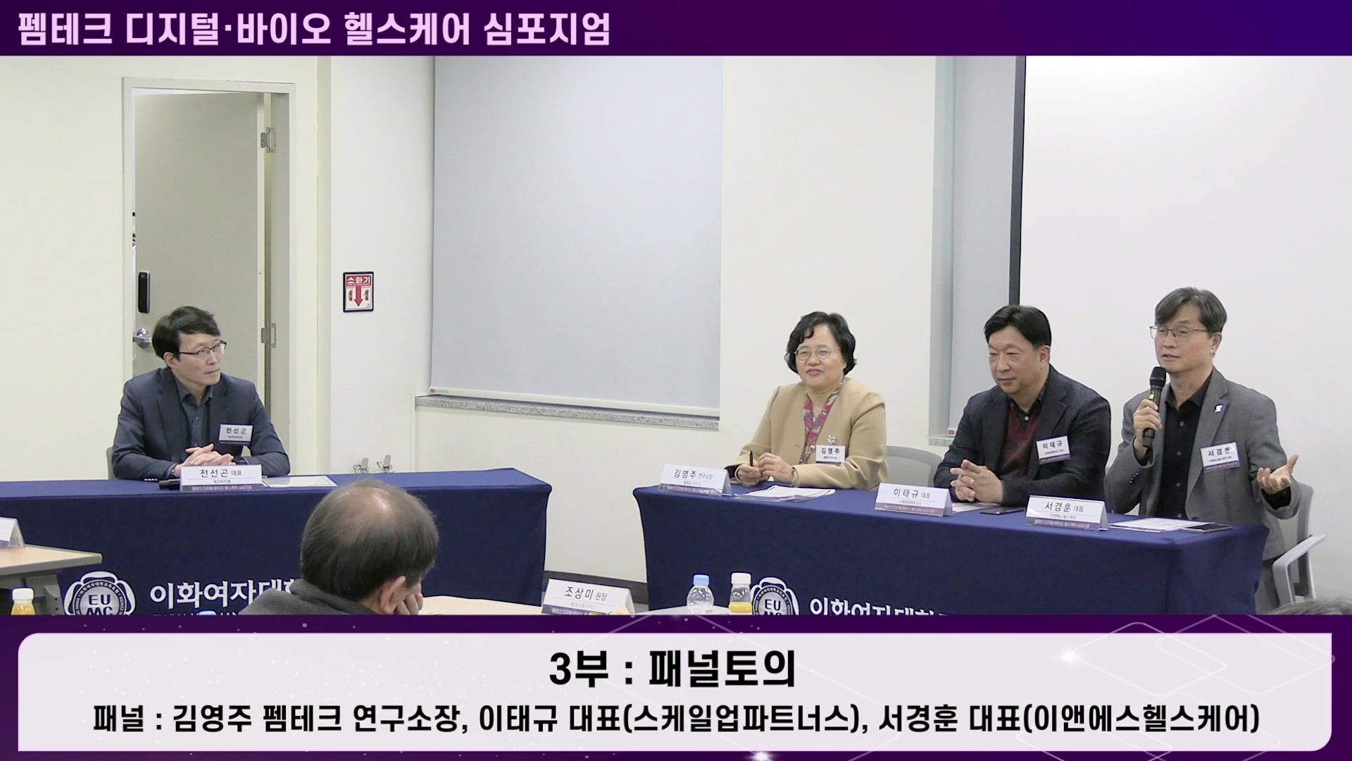 3부 패널토의에서는 김영주 펨테크 연구소장님, 이태규 스케일업파트너스 대표님, 서경훈 이엔에스헬스케어 대표님 세 분 패널들의 펨테크 연구소 향후 행보 및 발전방향 등의 토의가 있었습니다.